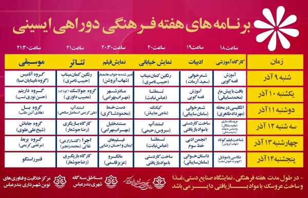 لازم به ذکر است این هفته فرهنگی از ۹ تا ۱۴ آذر ۱۳۹۸ در فرهنگسرای دوراهی ایسینی برگزار میشود و در حاشیه برگزاری این هفته نمایشگاه صنایعدستی، غذا و ساخت عروسک با مواد بازیافتی دایر است.